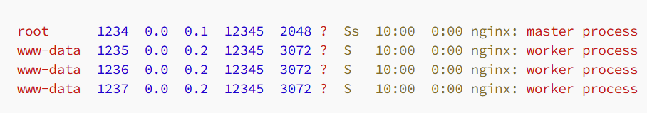 master-worker uma arquitetura de processo que o Nginx utiliza, e é uma das chaves para seu alto desempenho e estabilidade. Em resumo o master Controlar e Monitorar e o worker processa as requisições.Master carrega o arquivo nginx.conf e cria os processos Worker (sendo possivel recarregar o arquivo, com o comando reload, sem derrubar o sewrvidor). No Nginx, cada conexão que chega é designada para um dos Workers (cada um usa um nucleo do processador).Workers são processos que atendem as requisições dos clientes. Cada worker é independente e pode atender múltiplas conexões simultaneamente (número de Workers pode ser configurado). Cada worker gerencia de forma assíncrona (event-driven) essas conexões que recebem do master. ps aux | grep nginx gera algo como: