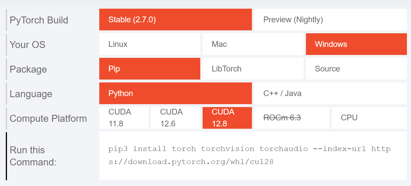 Veja a versão da CUDA (cuda: é a plataforma da NVIDIA para rodar cálculos na GPU) no site do Pytorch, após descobrir qual versão cuda da sua placa de video, selecione as configurações, que o comando será gerado: