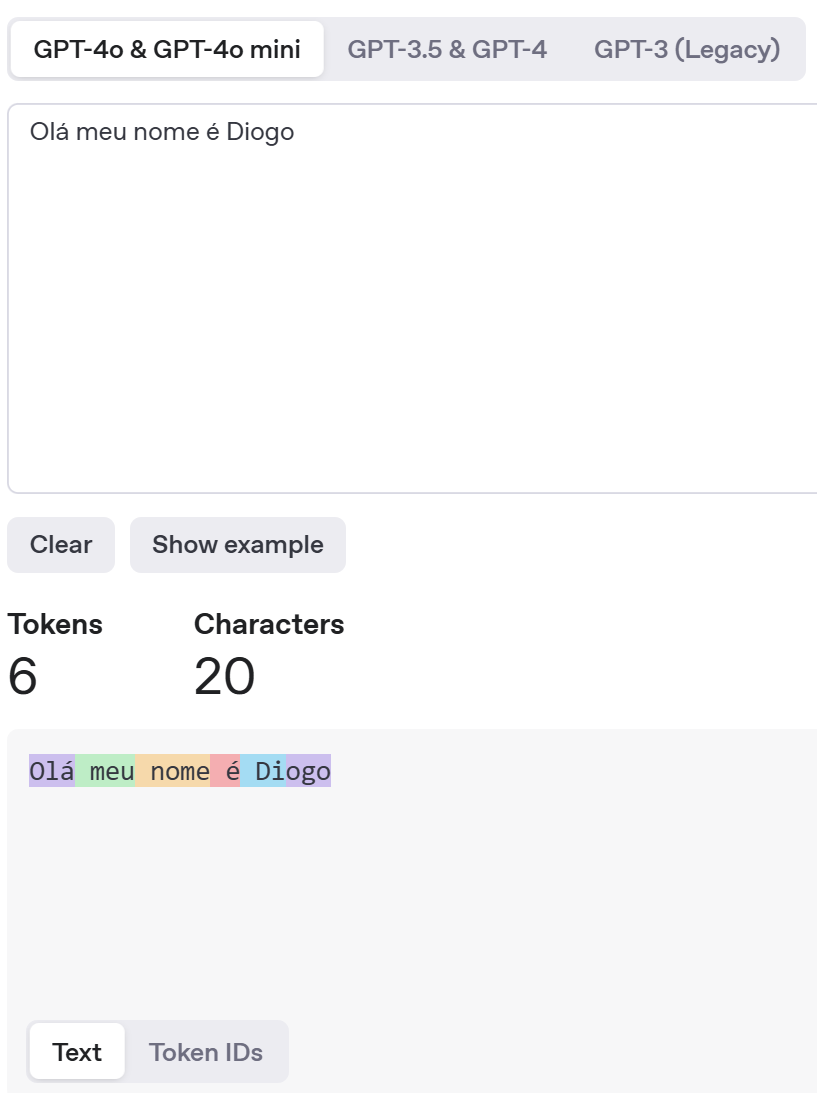 No exempo abaixo temos 6 tokens (pintados de cores diferentes), e o token id é um array com esses numeros: [89191, 18477, 16667, 1212, 9196, 16335]